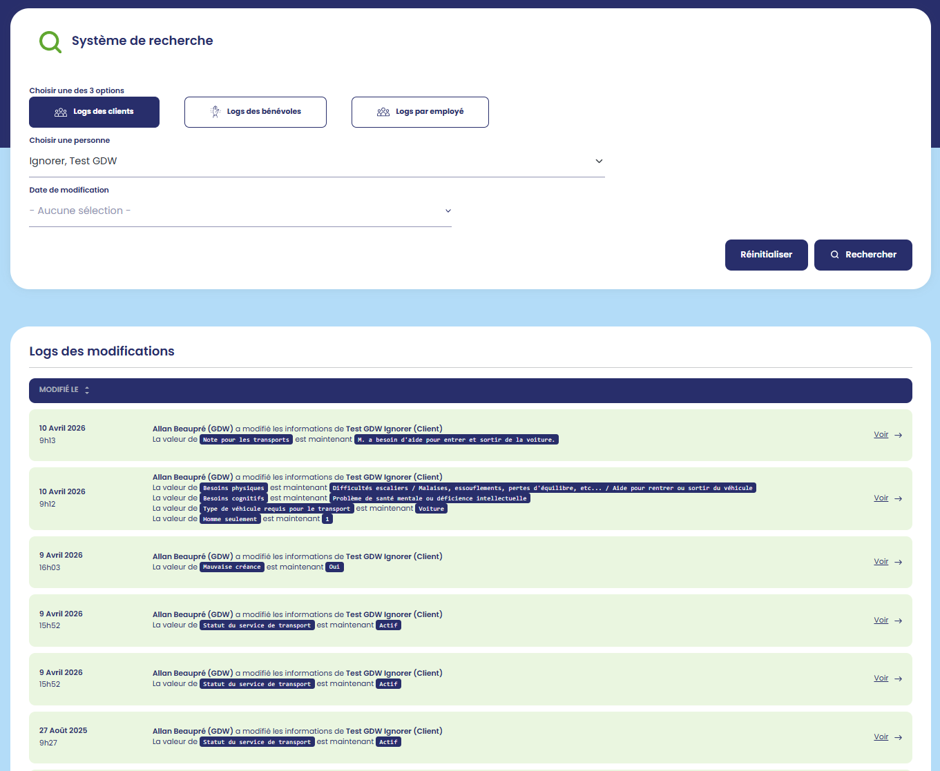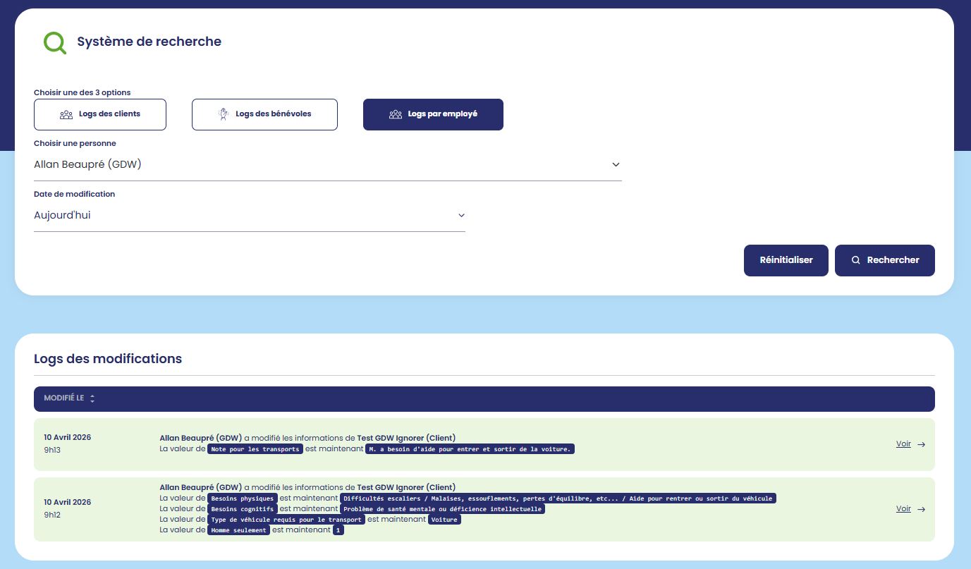 Il est également possible de filtrer les logs par employé. Pratique pour savoir qu'est-ce qu'un employé a fait aujourd'hui que ce soit dans les dossiers clients ou bénévoles.