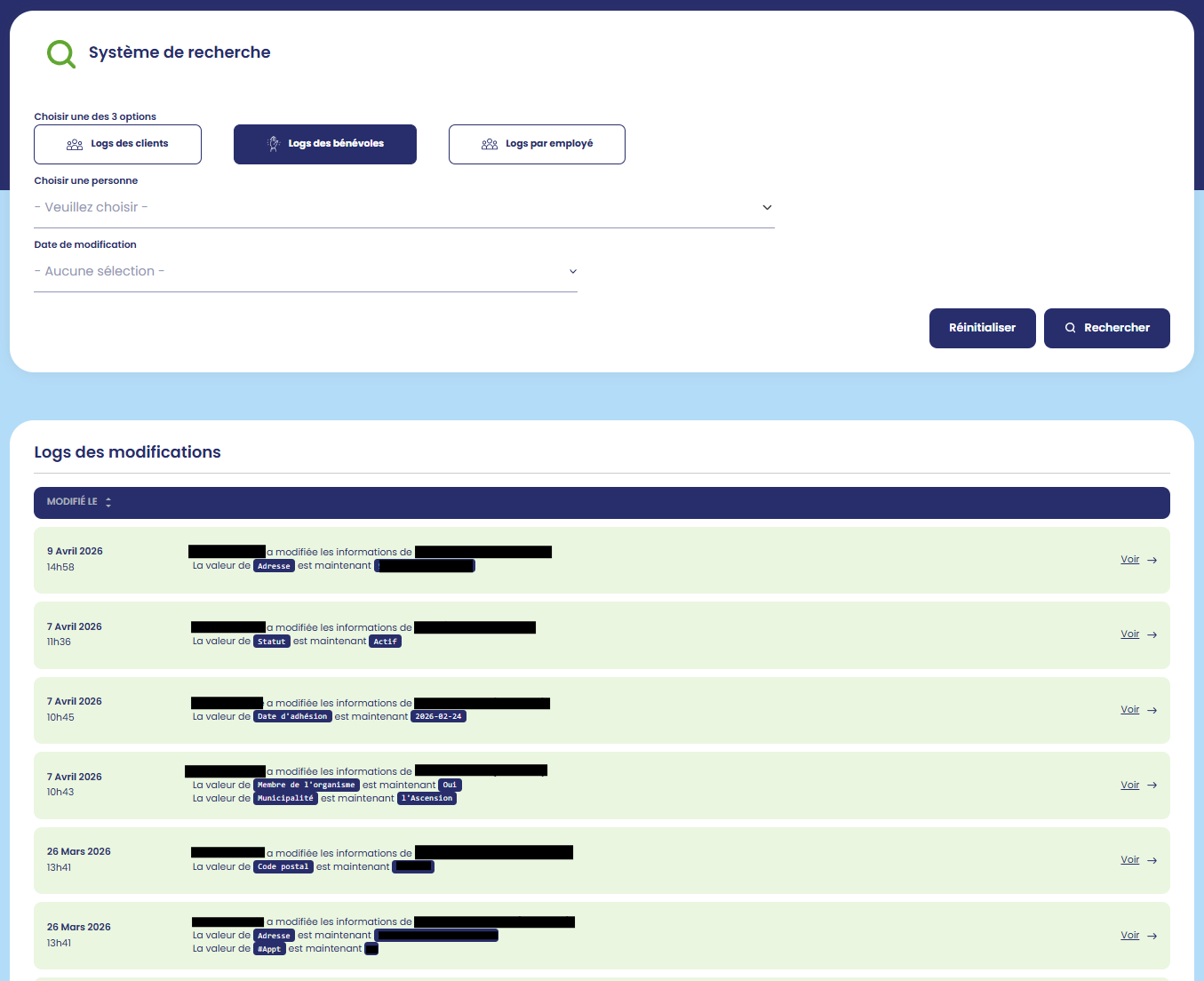 Les logs des bénévoles affichent, par défaut, toutes les actions qui sont effectuées dans les dossiers des bénévoles.