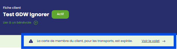 Lorsqu'une carte de membre est expirée, une alerte affiche dans le haut de la fiche du client. Les membres de l'équipe du CAB peuvent facilement la voir, chaque fois qu'ils ouvrent la fiche du client.